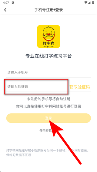 3、在手机号注册登录页面输入手机号,点击获取验证码。