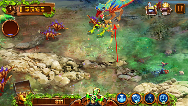2、攻击大型恐龙,瞄准场景中的大型彩色恐龙,发起攻击,造成大量伤害,获取更多分数和资源。