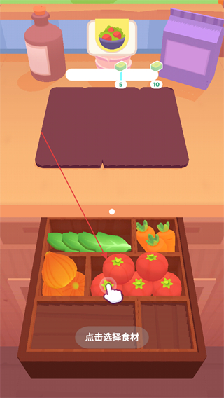 1、进入游戏界面,根据提示点击选择食材,从下方橱柜里选取需要的食材,如西红柿。
