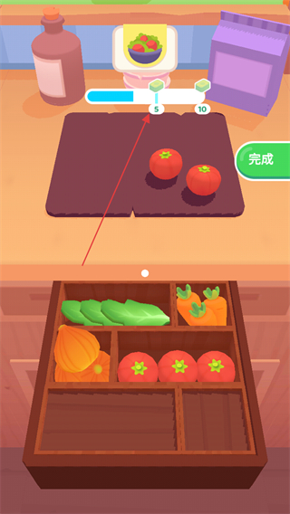 2、选择好食材后,将其放置在案板上,留意上方进度条,点击完成确认所选食材数量。