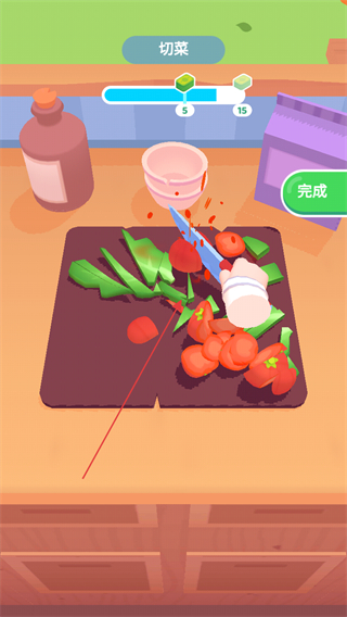3、进入切菜环节,按照要求滑动屏幕操控刀具,将案板上的食材切碎,同时关注进度条。