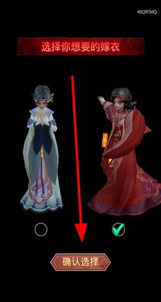 3、进入选择嫁衣的界面后,认真查看不同款式的嫁衣,挑选出自己心仪的那一款,选好之后点击确认选择按钮,完成嫁衣的选定。