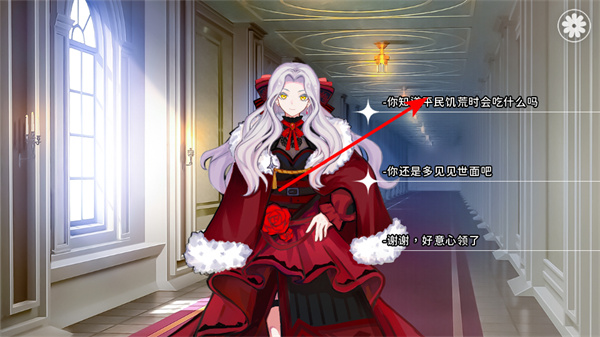 2、选择对话选项,在与红衣角色的对话中,选择你知道平民饥荒时会吃什么吗选项,开启该对话分支,影响剧情走向和角色互动。