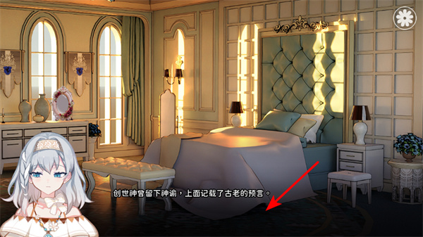 3、探索场景信息,在卧室场景中,点击剧情推进区域,阅读关于创世神留下神谕的剧情内容,获取世界观相关关键信息,推进进程。