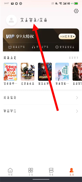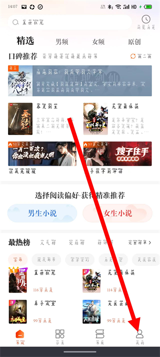 1、打开洋葱免费小说,点击底部导航栏最右侧的我的,进入个人中心页面。