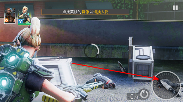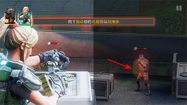 1、战斗时,向下拖动右拇指寻找掩体,这是保障自身安全的关键操作,找到掩体后可躲避敌人攻击,持续输出。