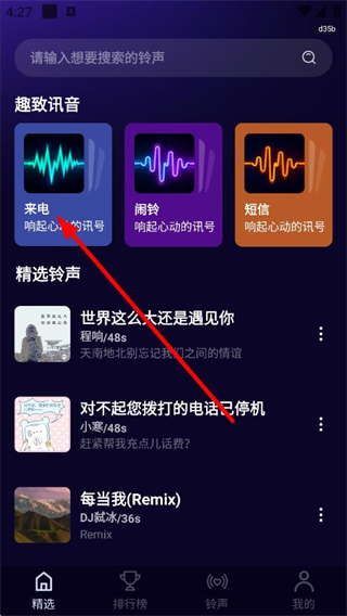 1、在酷乐免费铃声的首页,点击来电,进入来电铃声列表页面。