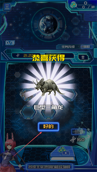 2、完成任务后,领取巨型三角龙等新物种奖励,点击好的继续游戏。
