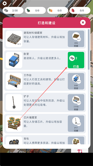 3、根据提示,在打造和建设界面选择建筑如卧室,点击打造按钮消耗资源进行修建。