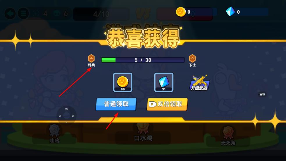 4、对战结束后,可获得金币、钻石、升级武器道具等奖励,提升军衔,助力角色养成。