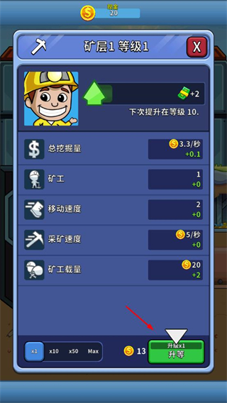 1、进入矿层升级界面,消耗金币提升矿层等级,可增加总挖掘量、矿工数量、移动速度、采矿速度、矿工载量等属性。
