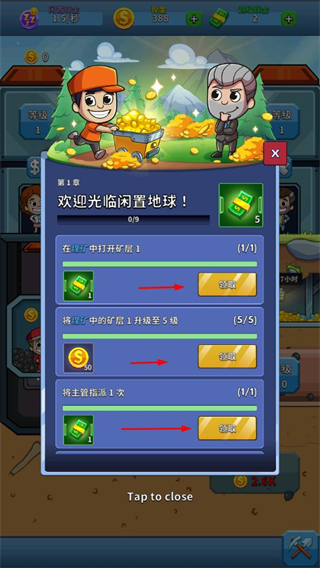 3、完成游戏任务如在矿场中打开矿层、提升矿层等级、招募主管,可获得钻石、金币等奖励,加速游戏发展。