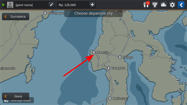 1、在游戏中,选择Manado作为出发城市,城市选择是规划行程的关键操作,选择后可确定巴士的起始站点,开启客运路线规划。
