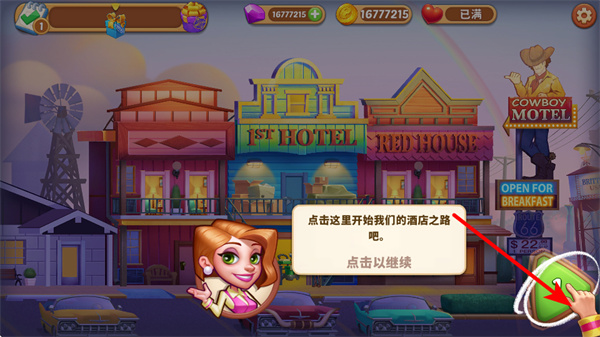 1、在游戏中,点击绿色按钮开启酒店经营之旅,经营开启是进入游戏的关键操作,点击后可正式开始酒店的运营管理。