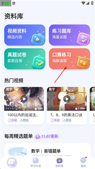 2、在资料库界面点击口算练习,进入口算练习界面。