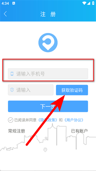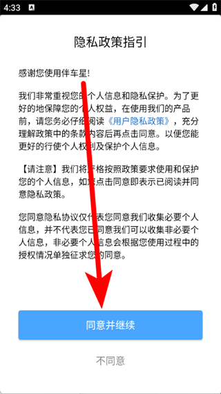 1、打开伴车星,在隐私政策指引弹窗,点击同意并继续。