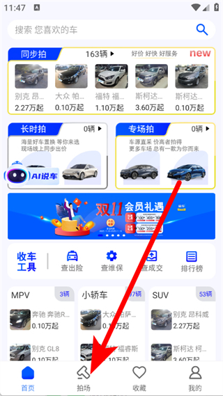 1、打开赢车网,点击底部拍场,进入拍场页面。