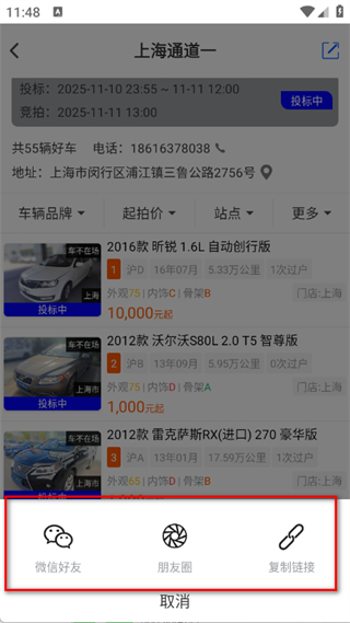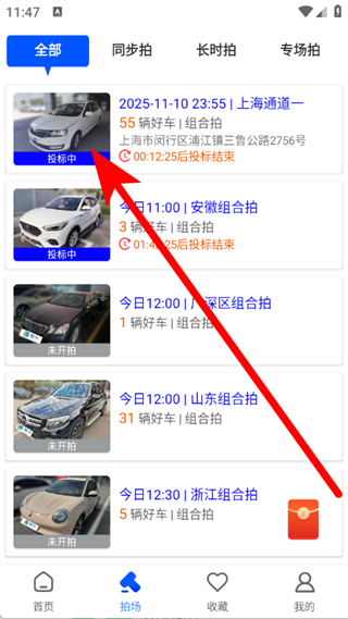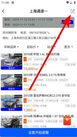 2、在拍场页面,点击上海通道一的车辆,进入车辆详情页。