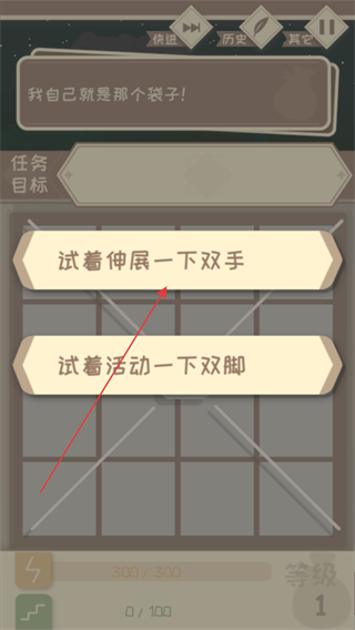 2、玩家开局除了知道自己是个袋子啥也不是,通过点击选项触发剧情框。