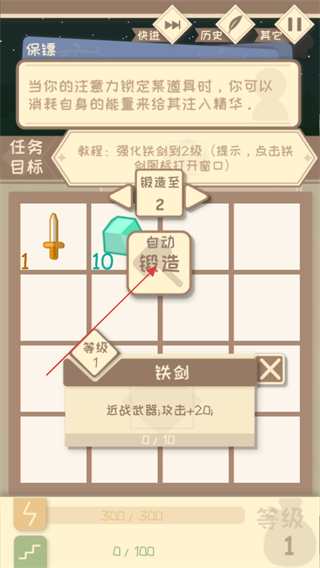 3、通过点击铁剑进行强化锻造,努力提升能力决定自己的命运和结局。