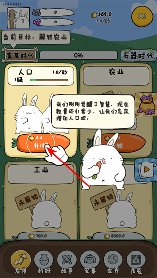 1、在发展界面,点击如胡萝卜标识的人口提升区域,可增加人口数量,这是推动文明发展的基础操作,工业等发展提供人力支撑,需优先提升。