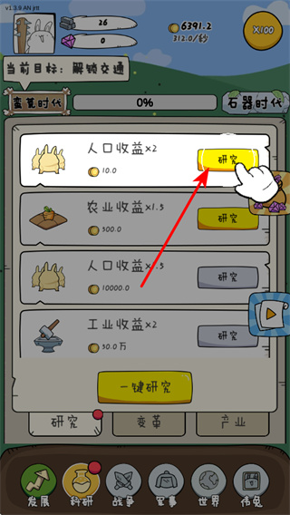 3、在科研界面,点击如人口收益×2的研究按钮,可提升对应领域的收益效率,这是优化资源产出的关键操作,研究后能显著提升人口带来收益。