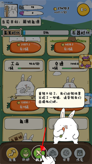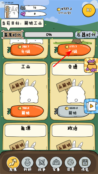 1、在发展界面,点击如石器时代农业区域的升级按钮,可提升农业产出效率,农业升级能为后续工业、交通等发展提供资源支撑,需优先进行。