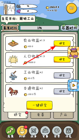 2、进入科研界面后,点击如农业收益×1.5的研究按钮,可提升农业领域的收益效率,这是优化资源获取的关键操作,研究后显著增加农业产出。