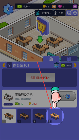 2、在办公室建设界面,根据提示选择需要添加的办公桌类型。