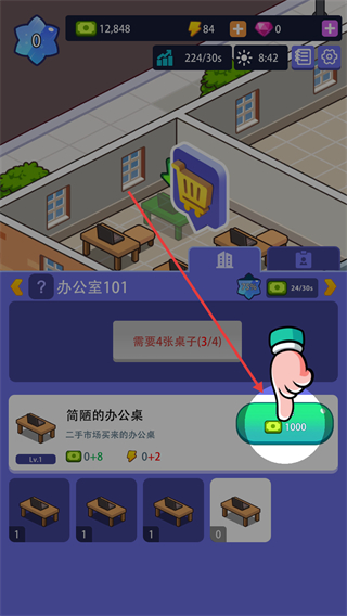 3、选择简陋的办公桌,点击1000货币按钮,花费货币购买。