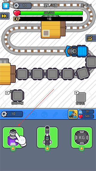 1、长按底部的炮台拖拽至火车的空白格子上,完成防御布局,不同炮台功能各异,需根据战术需求搭配。