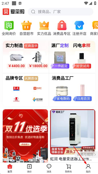 1、在百度爱采购首页,点击右下角我的选项,进入个人页面。