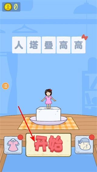 1、游戏中点击开始按钮,可进入人塔叠高高玩法,这是开启游戏的关键操作,点击后将开始堆叠挑战。