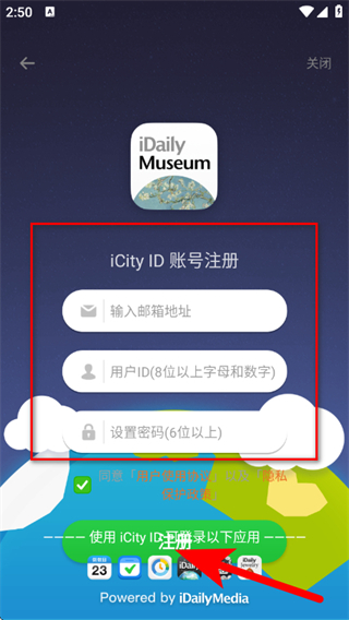 4、输入邮箱地址、用户ID、设置密码,点击注册,完成账号注册。