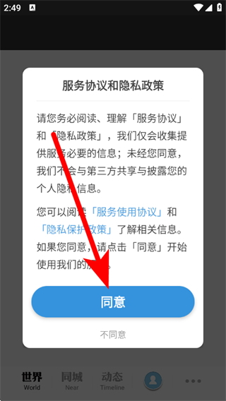 1、打开每日环球展览,在服务协议和隐私政策弹窗,点击同意。