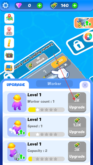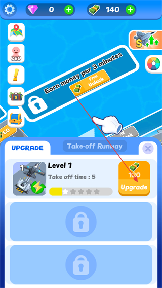 4、点击停机坪上的升级按钮,提升每辆飞机起飞后收取的收益价值。
