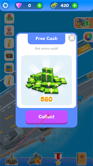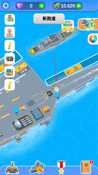 1、通过不断解锁设施提升航母掉落随机宝箱等,点击左侧掉落的宝箱资源可以获取钱币等物资。