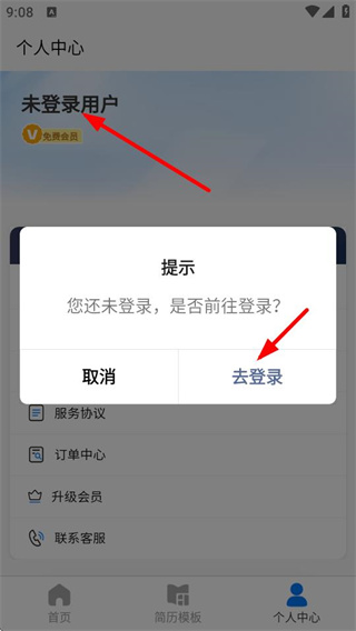 2、在个人中心页面,点击上方未登录用户,在弹出窗口点击去登录。