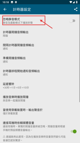 4、在计时器设置页面,找到忽略静音模式选项。