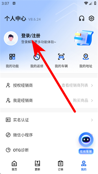 2、在个人中心页面中,点击登录注册,进入注册页面。