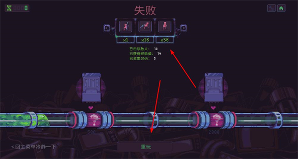2、在战斗失败后,查看战斗数据,点击重玩按钮重新挑战关卡,积累战斗经验与资源。