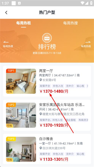 2、在租房服务页面里,点击热门户型区域的房源,进入热门户型排行榜页面。