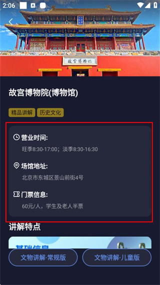 3、在故宫博物院详情页,即可查看其营业时间、场馆地址、门票信息等基础内容。