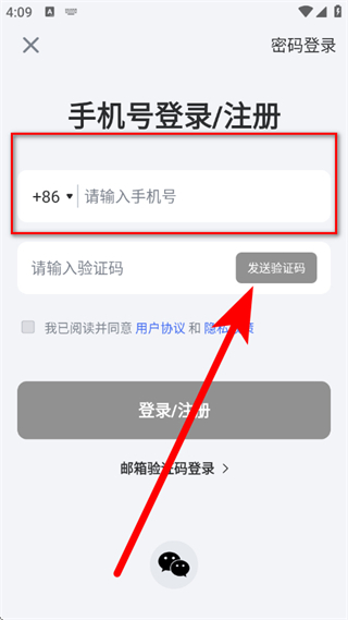 3、在登录注册页面,输入手机号后,点击发送验证码。