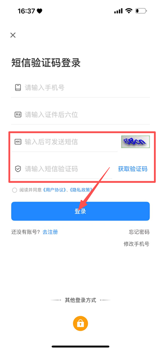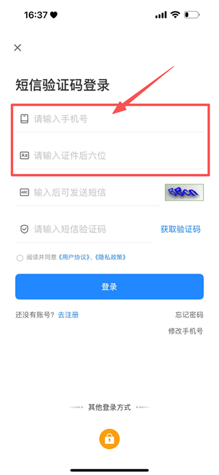 3、在短信验证码登录页面,输入手机号和证件后六位。