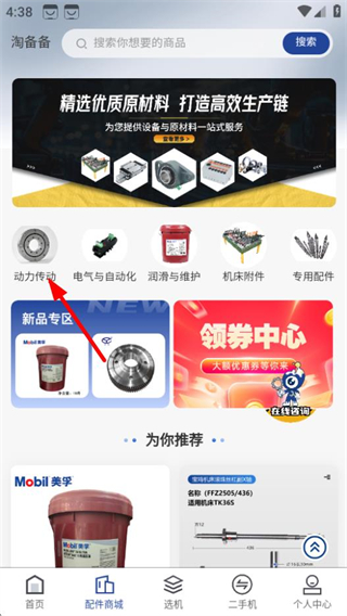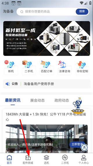 1、在淘备备首页,点击底部配件商城,进入配件商城页面。