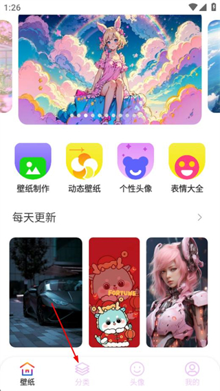 1、在11壁纸的壁纸页面,点击底部的分类选项,进入壁纸分类页面。