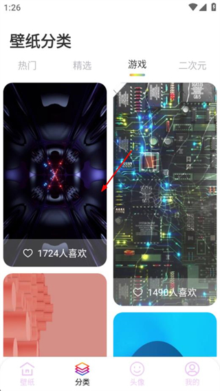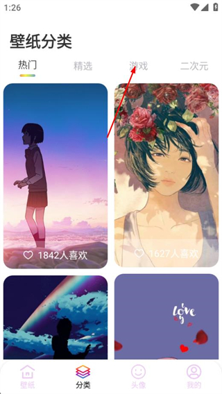 2、在分类页面,点击游戏标签,切换至游戏类壁纸列表。