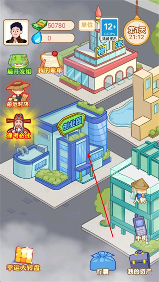 1、进入游戏主界面,点击创业园等建筑进入产业场景,开启经营流程。