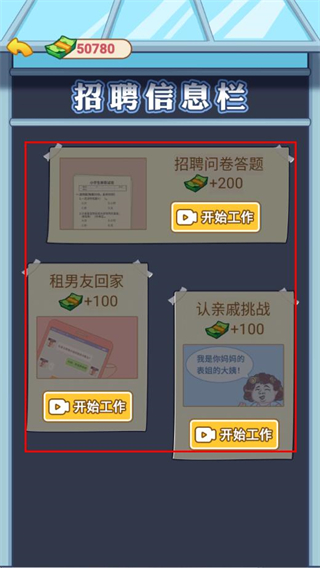 任务类型覆盖招聘问卷答题、租男友回家、认亲戚挑战等搞怪内容,结合趣味互动,打破传统经营手游的单调感,每一个任务都带有喜剧式的轻松氛围。